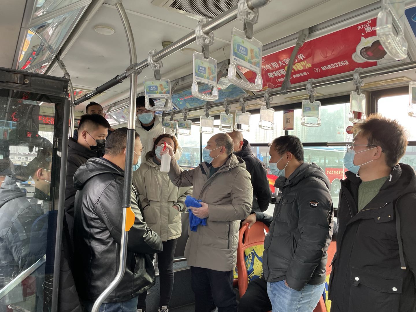 “報告,陳經(jīng)理,我是20路駕駛員周卓文,現(xiàn)在火車站上行方向站點,車廂內(nèi)共有乘客10名,其中有1名中年男性乘客從前門上車,對其測量體溫時,發(fā)現(xiàn)該名乘客體溫達(dá)到37.5℃,我們已經(jīng)在車廂內(nèi)自行隔離,請派人來幫助我們。”“這位乘客,你的體溫偏高,請配合我們的隔離處置工作。”這是12月23日公交集團(tuán)公交事業(yè)一部開展防疫應(yīng)急處置演練的生動場景。