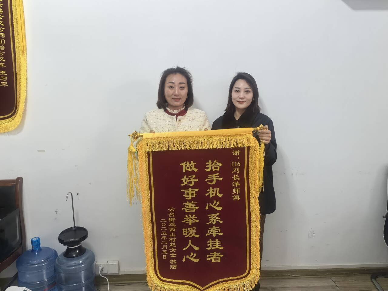 第一面錦旗由市民趙女士贈送。趙女士提到,上周她乘坐公交車時,不慎將手機遺落在西山村委會附近,116路駕駛員劉長洋在行駛至西山村委會時發(fā)現(xiàn)了這部手機,并設(shè)法歸還。為了表達(dá)感激之情,趙女士特意制作了一面錦旗,上面寫著“拾手機心系牽掛者,做好事善舉暖人心”。