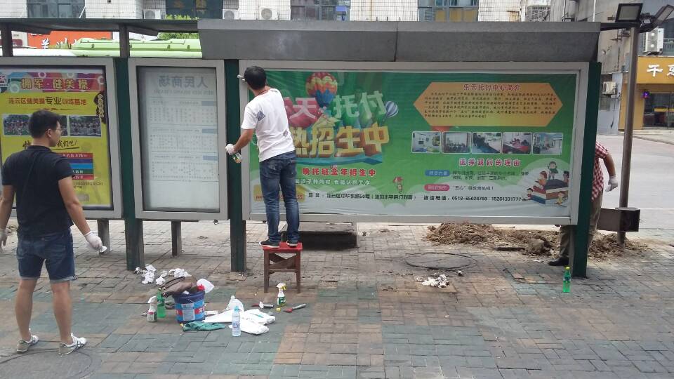 此次活動(dòng)的開展,再一次清理了站牌上的小廣告,清洗了站亭的立柱、玻璃等。大家不怕臟和累,不畏天氣炎熱,對(duì)一些貼在高處的小廣告,踩著凳子,用綁著竹竿的鐵鏟,一點(diǎn)一點(diǎn)地清除干凈。