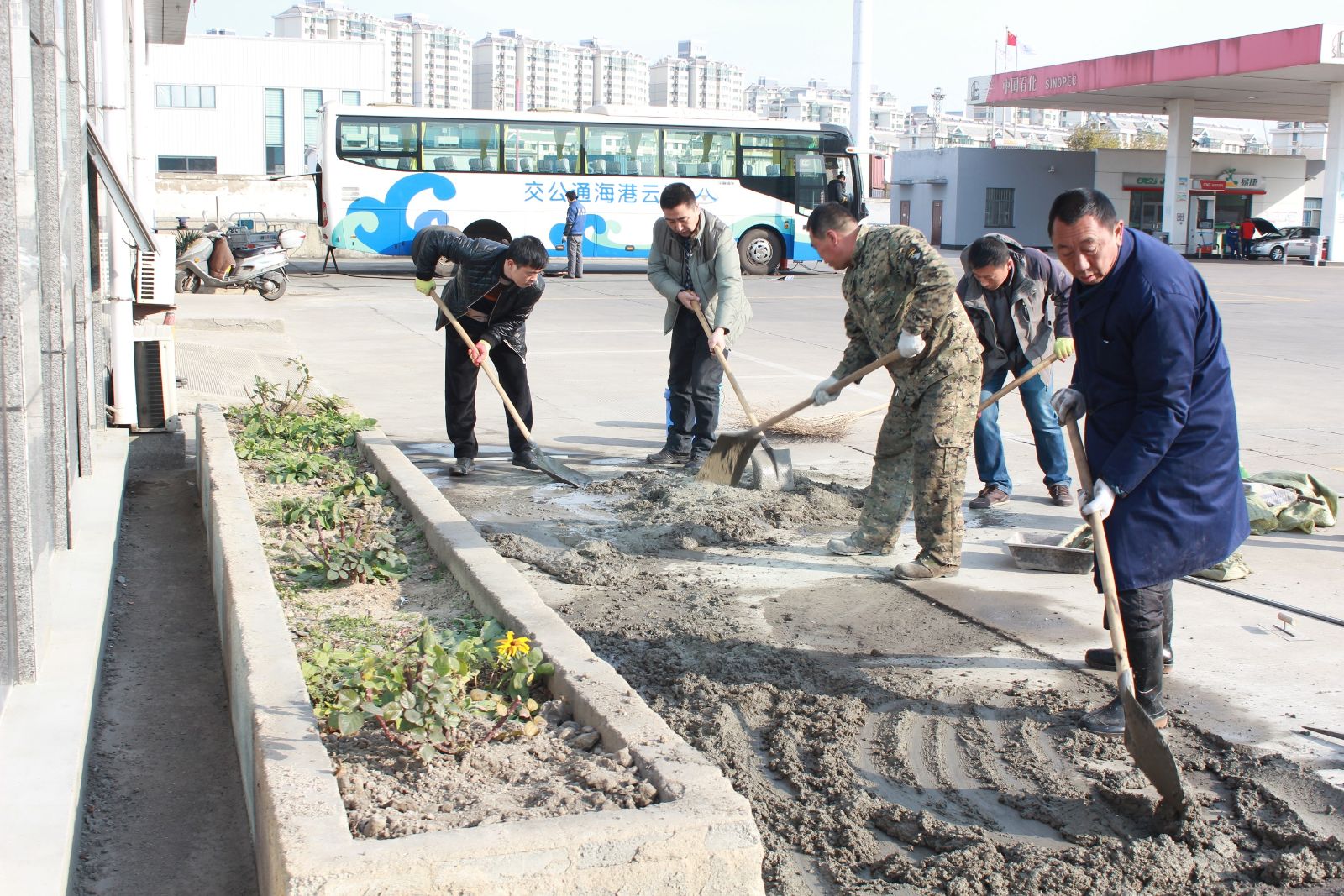 為做好創(chuàng)衛(wèi)工作,確保責任區(qū)域干凈、整潔及美化工作環(huán)境,12月9日上午,公交東部公司開展公司總站場地面修繕工作。公司副書記寧濘、副經理張煒帶領管理人員將公司場站內多處破損的水泥地面重新修補平整。由于缺少相關材料和工具,大家獻計獻策、分工合作,有的攪拌水泥、有的用抹子將水泥面抹平……整個過程進展很順利,地面修繕效果較好。