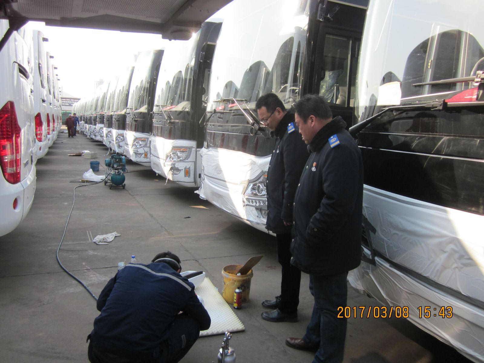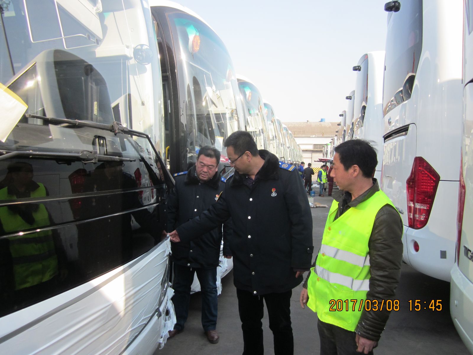 接到任務(wù)大家都感到壓力很大,因?yàn)楣恍蘩砉尽⒋笃謴S以往一天的工作量只能完成40臺左右高檔巴士整備工作,而現(xiàn)在任務(wù)是70臺一天,于是公司領(lǐng)導(dǎo)班子立即召開專題會議,高度重視該批車輛出口任務(wù),精心布置抽調(diào)熟悉業(yè)務(wù)的精兵強(qiáng)將20人組成突擊隊(duì)。3月8日早上5點(diǎn)鐘,一行20人的突擊隊(duì)準(zhǔn)時(shí)出發(fā)奔赴港口,中午,打來快餐在工地現(xiàn)場就餐,放棄午休,連班作業(yè),下午趙玉軍經(jīng)理、楊國軍書記又親臨作業(yè)現(xiàn)場為大家鼓勁,并作安全作業(yè)交代,在大家的共同努力下直到晚上11點(diǎn)多鐘終于完成了70臺高檔車裝船前的整備工作,此項(xiàng)任務(wù)的如期完成也受到了外商及宇通客車廠家的高度評價(jià)。