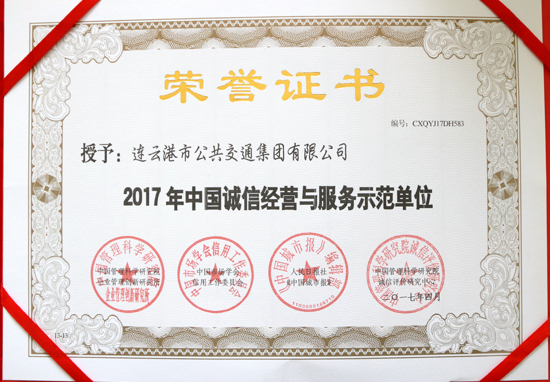 公交集團(tuán)有限公司作為城市重要窗口行業(yè),多年來一直秉持“服務(wù)于民、奉獻(xiàn)社會”的宗旨,始終堅(jiān)持誠信為本的理念,以誠信、優(yōu)質(zhì)的服務(wù),倡導(dǎo)“誠信服務(wù)、真情奉獻(xiàn)、開拓創(chuàng)新、和諧發(fā)展”的企業(yè)精神,在推進(jìn)良好社會風(fēng)氣的形成,構(gòu)建和諧社會,傳播精神文明等方面發(fā)揮著重要作用。經(jīng)過前期各個(gè)部門的評審、公示、復(fù)查等程序,連云港市公交集團(tuán)榮獲第十四屆“中國誠信經(jīng)營與服務(wù)示范單位”殊榮。