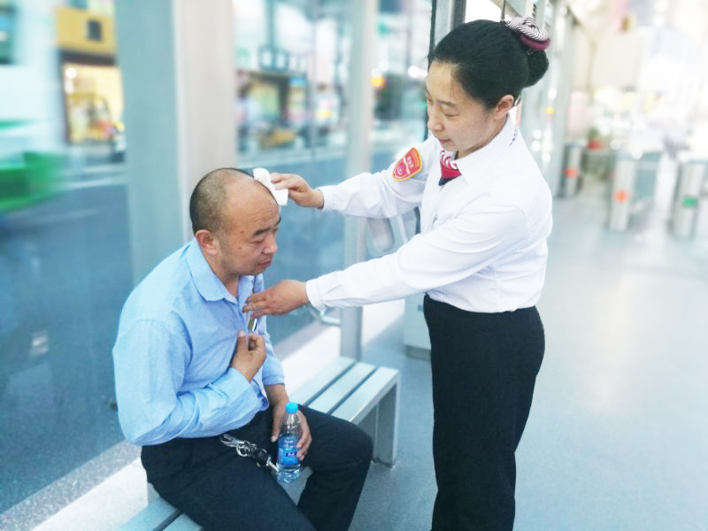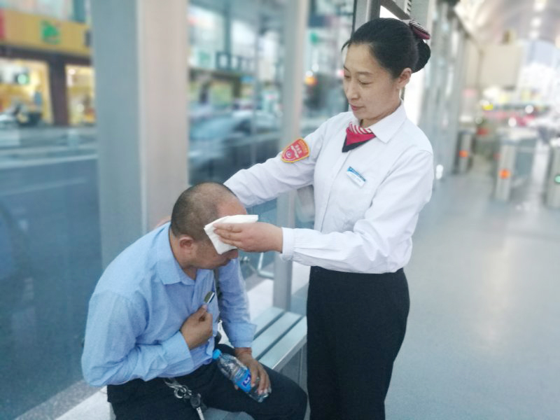 一次,我在移動公司站上晚班,有位老人下車后便趴在安全門上,我便用廣播安全提示:“乘客們,你們好,為了您的安全,請您不要趴靠安全門,請您退到安全線后耐心等待。”忽然看見老人倒地,我趕緊攙扶他坐到站內椅子上,詢問他是怎么了,還沒開口,他就出現(xiàn)心慌手抖、嘔吐等現(xiàn)象。我趕緊撥打120,同時也像智能調度中心報告站臺的實況。等待120過程中,我一邊幫他擦汗,一邊輕拍他的胸口幫助他呼吸順暢。沒多久,老人的家人和120前后腳便到了,他的家人激動地握住我的手說:“太感謝你了,多虧有你們,我們家老年人身體一直不是太好,可是又喜歡出來散悶,今天如果沒有你在,真不知道怎么辦了。”當時聽了這話,我的心里感受到不一樣的溫暖,內心無比自豪。我笑著對他們說:“這是我們應該做的,您太客氣了。”