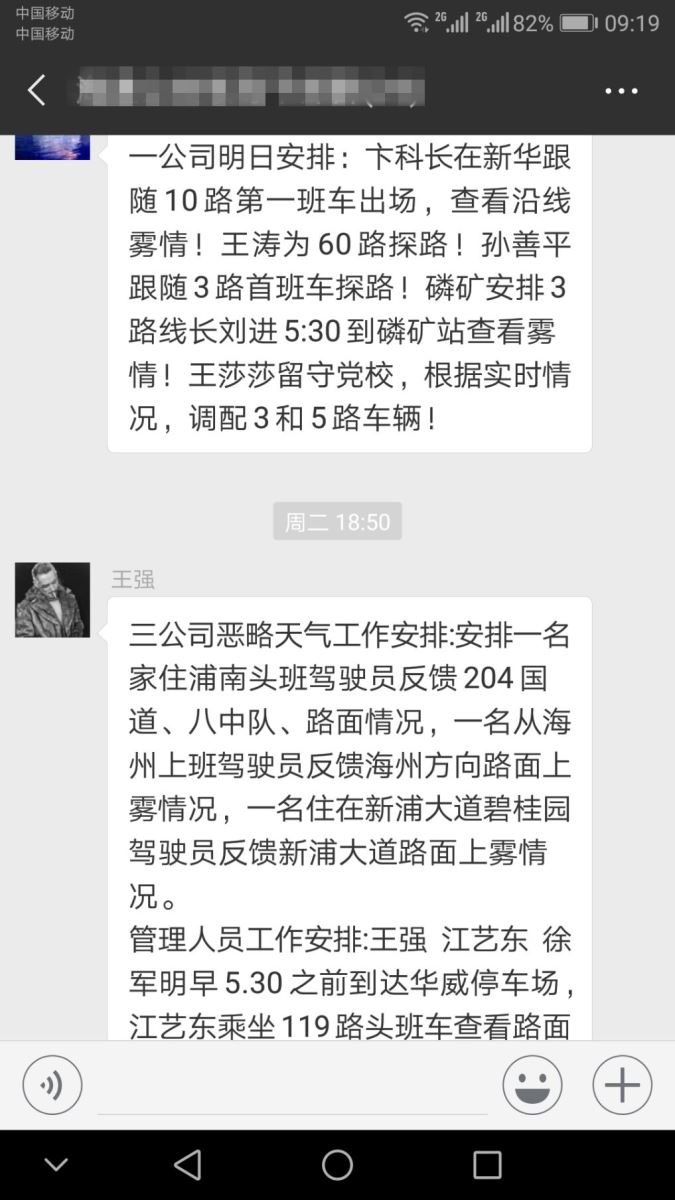 11月27日凌晨,大霧如期而至,公交集團(tuán)海通公交公司微信群早已信息不斷,管理人員全部提前到崗,進(jìn)入“備戰(zhàn)狀態(tài)”。朱華麗強(qiáng)調(diào):一是各分公司要加強(qiáng)工作聯(lián)動性,做到路況信息資源共享。二是期間出場車輛定要加強(qiáng)安全交待,做到不安全,不生產(chǎn)。三是在天氣條件轉(zhuǎn)好的情況下也不能放松安全這根弦,要全方位提升駕駛員安全預(yù)防意識。四是大霧惡劣天氣從11月27日至11月30日,全體管理人員要做好打“持久戰(zhàn)”的準(zhǔn)備,切實(shí)做好冬季惡劣天氣安全行車無事故工作。