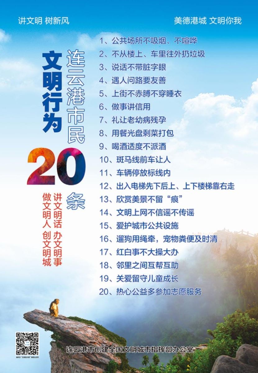 你們好!創(chuàng)建全國(guó)文明城市,提高城市文明程度,建設(shè)文明幸福、風(fēng)景優(yōu)美、高質(zhì)發(fā)展的連云港是港城人民的共同心愿。讓我們積極行動(dòng)起來,從自己做起,從具體事情做起,為港城更美好的明天出一份力。