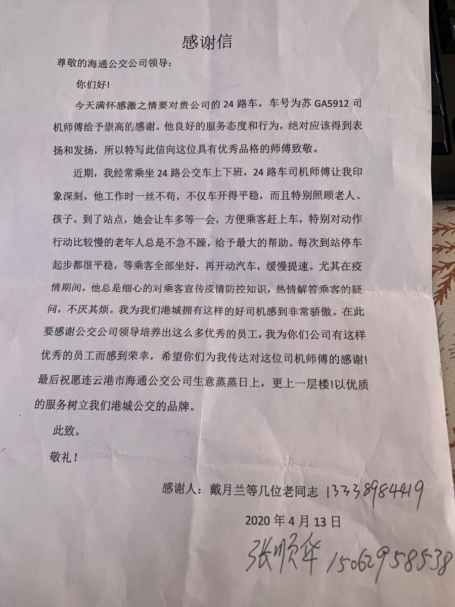 信中,戴女士表示她經(jīng)常乘坐24路公交車上下班,徐剛師傅讓她印象十分深刻,他不僅車開的平穩(wěn),而且對待老人、孩童的態(tài)度也非常和藹。每當看見行動較慢的老人往站點趕時,徐師傅總是不急不躁,耐心等候,攙扶老人上車,直到老人坐穩(wěn)才駕車駛離站點;每當遇到放學的學生乘車時,他總是提醒車內(nèi)乘客給孩子讓個座。疫情期間,徐師傅細心的為乘客宣傳疫情防控知識,熱心解答乘客的疑問,不厭其煩。戴女士為港城能擁有這樣的好駕駛員感到驕傲。