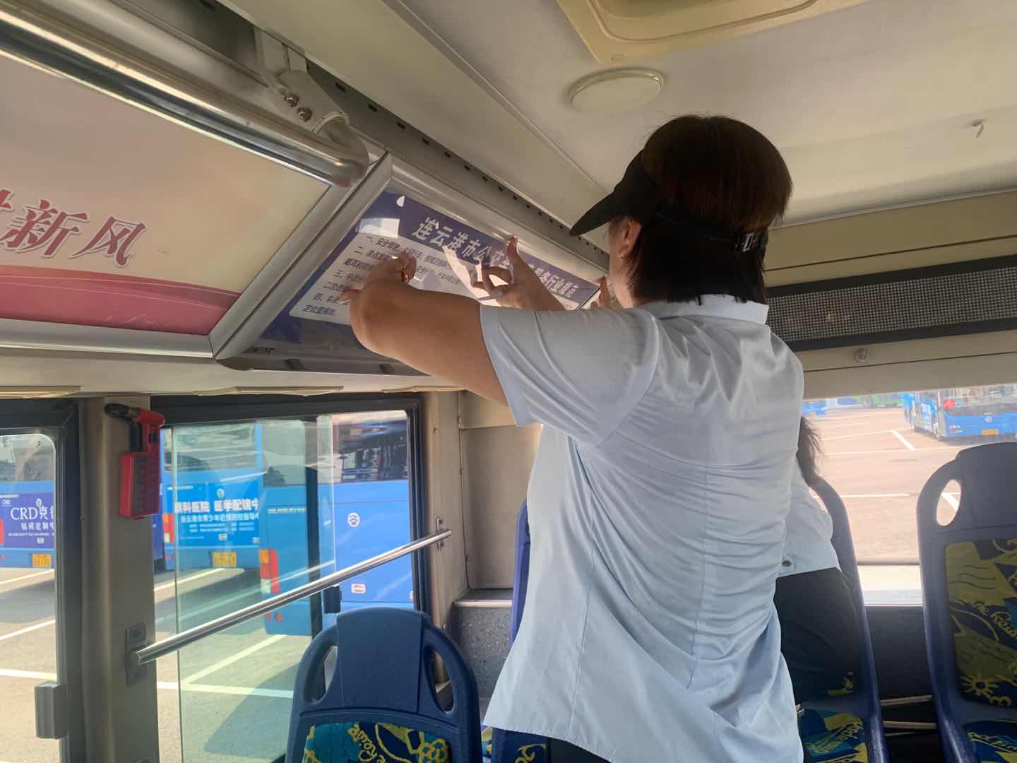 分公司管理人員不懼炎熱,將車內(nèi)展板更換上“文明行為規(guī)范”,讓乘客在乘車的同時(shí)文明思想意識(shí)得到提高,爭(zhēng)做文明人,共創(chuàng)文明港城。