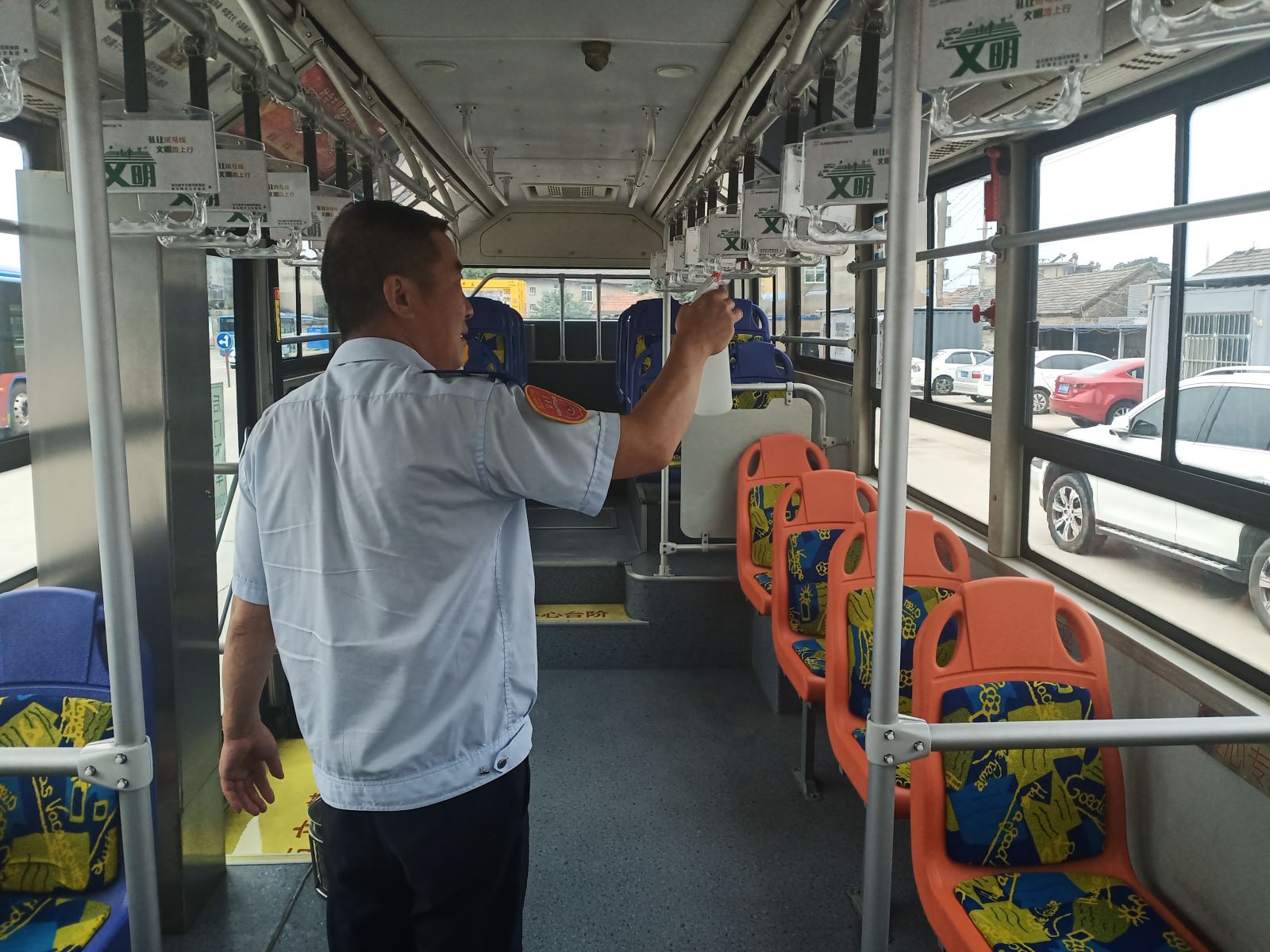 為了給乘客營造一個(gè)干凈、健康的乘車環(huán)境,駕駛員在第一時(shí)間為愛車“清洗”,首先利用洗車機(jī)將車身外部清洗干凈,然后對(duì)車廂內(nèi)部進(jìn)行打掃,擦拭駕駛室內(nèi)的衛(wèi)生死角,拖地板、擦玻璃、座椅、扶手等。為確保疫情期間做好防控工作,還要對(duì)車內(nèi)進(jìn)行消毒,并打開門窗通風(fēng)透氣。
