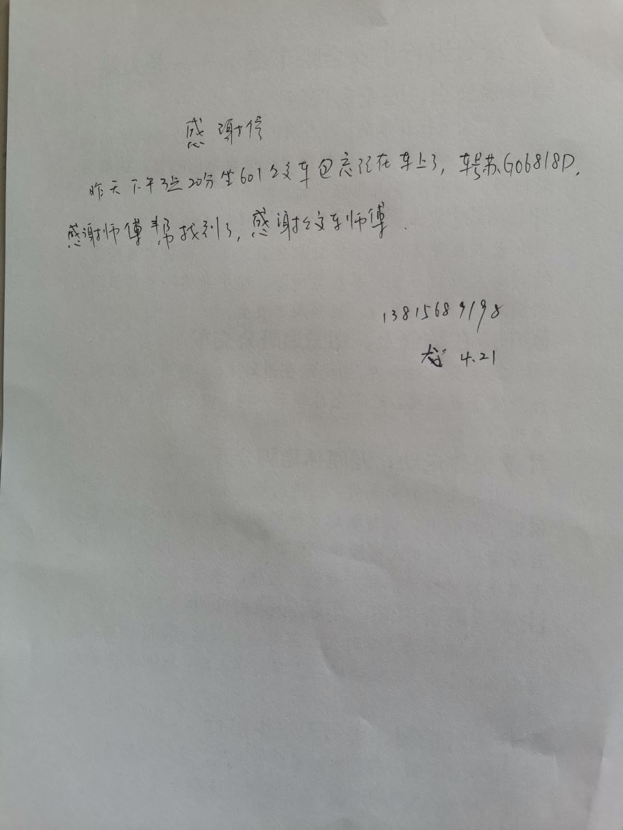 沒過多久,失主尤女士來到了大港路停車場調(diào)度室領(lǐng)取了自己丟失的包及手機,她當(dāng)場寫下感謝信,對李傳新師傅表示萬分感謝。