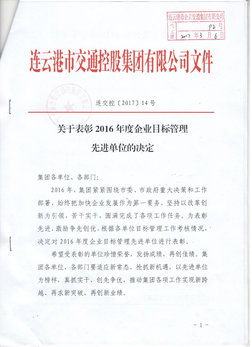 公交集團(tuán)榮獲2016年度交控集團(tuán)企業(yè)目標(biāo)管理暨黨建、宣傳工作三項(xiàng)一等獎(jiǎng)