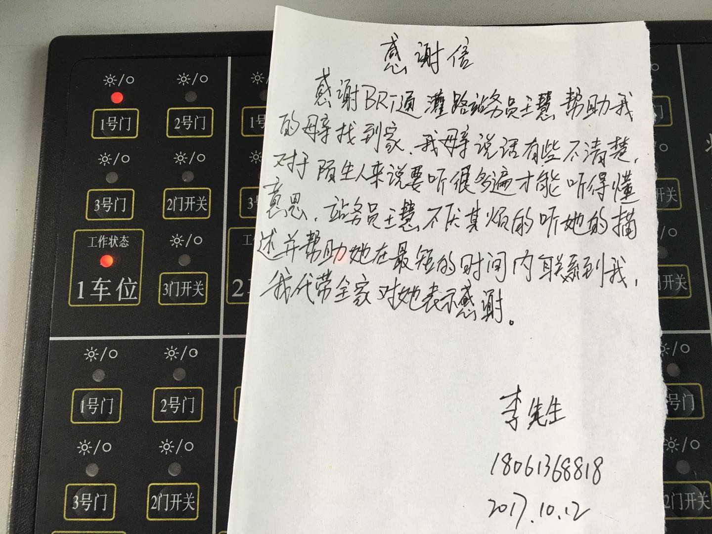2017年10月11日的晚上,從B12車上下來(lái)一位神色慌張,說(shuō)話不清楚的老人,在我慢慢的詢問(wèn)下得知老人是迷路了。“老人家,您不要慌,有沒(méi)有家里人的電話號(hào)碼?我讓您的家里人來(lái)站臺(tái)接您”。在等家人來(lái)接老人期間,我不斷地安撫著他的情緒。不一會(huì),他的兒子過(guò)來(lái)接她,老人在跟隨他兒子離開(kāi)的時(shí)候,一直不停的對(duì)我說(shuō)著說(shuō)謝謝。第二天,老人的兒子專程送來(lái)了一封感謝信,當(dāng)看到沉甸甸的信件時(shí),我的心里暖暖的。