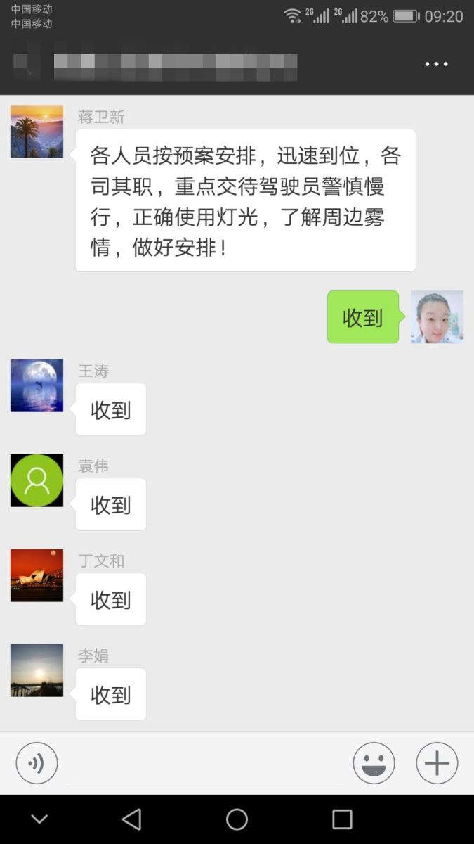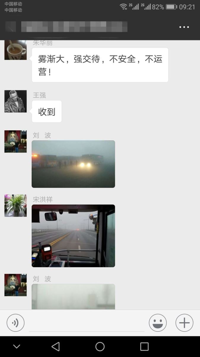 11月27日凌晨,大霧如期而至,公交集團(tuán)海通公交公司微信群早已信息不斷,管理人員全部提前到崗,進(jìn)入“備戰(zhàn)狀態(tài)”。朱華麗強(qiáng)調(diào):一是各分公司要加強(qiáng)工作聯(lián)動性,做到路況信息資源共享。二是期間出場車輛定要加強(qiáng)安全交待,做到不安全,不生產(chǎn)。三是在天氣條件轉(zhuǎn)好的情況下也不能放松安全這根弦,要全方位提升駕駛員安全預(yù)防意識。四是大霧惡劣天氣從11月27日至11月30日,全體管理人員要做好打“持久戰(zhàn)”的準(zhǔn)備,切實(shí)做好冬季惡劣天氣安全行車無事故工作。