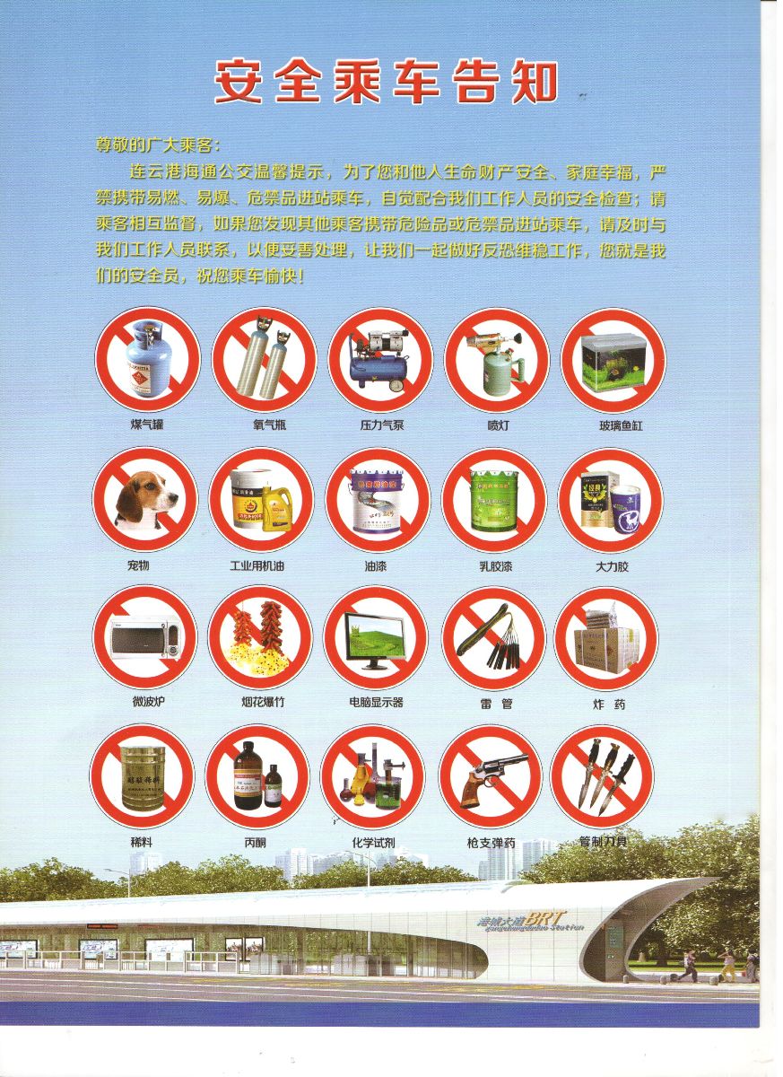 為確保活動(dòng)取得成效,公司結(jié)合當(dāng)前反恐維穩(wěn)嚴(yán)峻形勢(shì),制作圖文并茂的安全生產(chǎn)宣傳資料——《海通公交安全乘車溫馨提示》,于咨詢?nèi)债?dāng)天在九龍大世界廣場(chǎng)、BRT市民廣場(chǎng)站、新浦火車站廣場(chǎng)以及海州客運(yùn)站面向廣大市民發(fā)放1500余份,提醒廣大乘客不要攜帶易燃易爆等危險(xiǎn)品乘坐公交車,呼吁廣大乘客強(qiáng)化安全意識(shí),人人爭(zhēng)做“安全員”,自覺(jué)維護(hù)乘車安全。