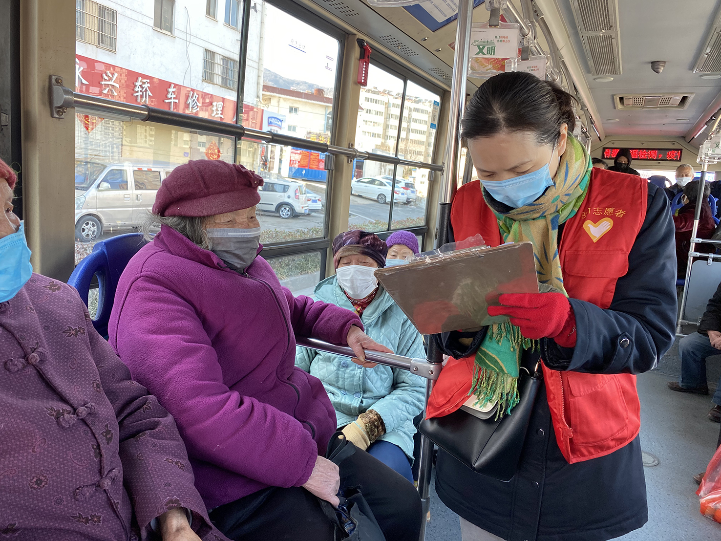 東部城區(qū)公交31路自園丁小區(qū)發(fā)車,終點站連云古鎮(zhèn),每天的乘客老年人占大多數(shù)。為更好地宣傳疫情防護工作,3月5日公交事業(yè)二部13名志愿者分兩人一組,到公交31路車廂內(nèi)開展志愿服務(wù)活動。引導(dǎo)乘客申請“連易通”二維碼,并正確使用。但是31路公交車上老年人居多,最多的一趟班次中,共35人乘車,其中有33位是老年人,有一些年齡大的老人,連自己的電話都記不得。志愿者們提前做好功課,了解31路乘車群體特征,準備了登記簿,詳細、耐心地為這些不能出示“連易通”二維碼的老年乘客進行姓名、社區(qū)、聯(lián)系方式登記,還勸說老年乘客非必要盡量減少外出,無法出示的“連易通”綠色二維碼請家人幫忙申請并打印后隨身攜帶。